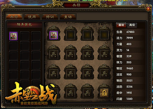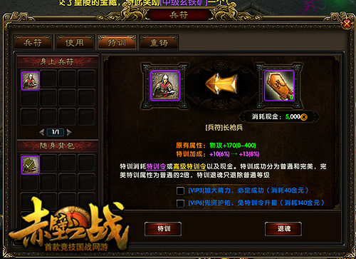 在《赤壁之战》中,玩家还可以通过兵符系统,对自己喜欢的兵符进行特训,让其属性加成效果,得到进一步的提高和飞跃。而当你对某一兵符的加成属性不是特别满意时,则可以选择兵符重铸功能,对其加成属性进行重铸,以便获得更加满意的强化兵符。玩家除了可以装备兵符外,还可以把兵符当做游戏道具,进行一次性使用,获得一定时间的BUFF效果加成,增益时间一般为20分钟。但兵符一旦被使用之后,将会彻底消失,所以兄弟们在选择直接使用兵符时,一定要谨慎。当自己具有多余的兵符或即将参加某场重要大战时,可以考虑使用游戏兵符。