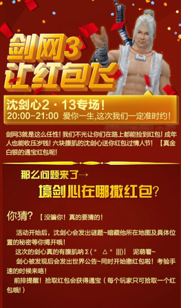 《剑网3》让红包飞今晚20:00-21:00,剑心将准时现身各大区服与广大玩家拜年,并在世界频道中以字谜的形式提示众侠士自身当前所在场景及位置。待玩家洞悉谜底后,即可前往寻找。剑心会在有侠士到来之时发放红包。剑心将在每个区服发放总值250万通宝的红包,每位侠士皆可拾取一次。红包内附通宝,面额有大有小,看看谁是小红手!