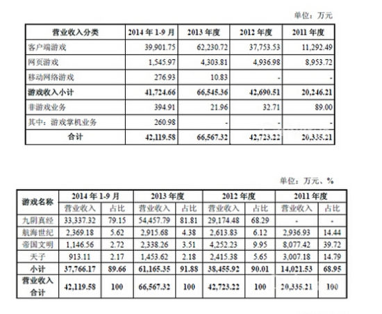 同时所披露的主要产品数据中,《九阴真经》截止至2014年9月30日累计注册用户数量为2888万人。2014年1-9月,该游戏平均月活跃玩家数量为91.95万人次,月平均付费用户数9.66万人。而截止2014年12月31日,手游《太极熊猫》(2014年9月上线)累计充值金额为9900万元。