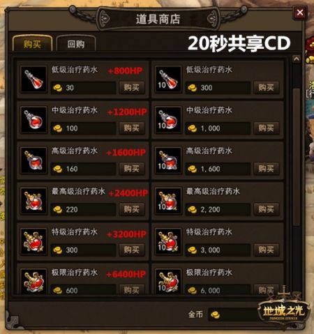 在游戏中最容易购买的加血药品,品种众多价钱各异,大家可以根据角色的血量购买合适的。