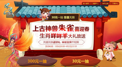 百万在线网游大作《问道》喜迎春,神兽变异送好礼,趣味抽奖惊喜多。千万朱雀、咩咩羊、元灵精魄等你来拿,只需30元即可拥有一次抽奖机会,朋友们你们还在等什么,赶快参加活动来赢取你的元灵吧!