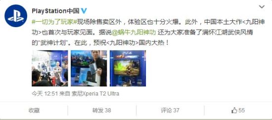 索尼官方微博贺电活动现场,热闹而有序,九阳神功主题的宣传片、精美海报、PS外包装定制版等处处让人感受到浓浓的中国武侠风,与此同时,网络上也随处可见九阳神功,包括目前非常流行的斗鱼、战旗等在线直播平台,也不断看到《九阳神功》的国行试玩直播。笔者粗略统计,像斗鱼单个主播的《九阳神功》直播就达到超过12万人的在线收看,弹幕爆屏,随后更是推上首页,九阳神功热度可见一斑。