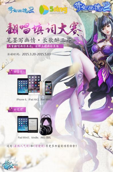 三月初春,柳绿莺时,3月20日,网易第一古风玄幻网游《倩女幽魂2》携5sing中国原创音乐基地开启翻唱填词大赛!即日起至5月3日,《兰若词》、《十世镜》、《拂世之剑》、摇滚版《兰若词》、《一米六的日常》等倩女经典歌曲均属此次翻唱可选曲目,此外还有1首以即将上线的神秘前世玩法为背景的填词曲目,其冠军作品将作为官方版本由获奖歌手演唱发布!