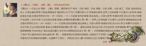 在《龙之谷》战士之歌黑暗绝唱音乐大赛作词部分,也有一个新晋人气作品,成功收获了过百玩家的支持。由“滚来滚去的羽悠”所创作的歌词《曙光》则让人看到了战士玩家对于冒险、对于追梦的坚持。“世界上没有绝望 不过是内心的悲凉 破晓前谁在彷徨 还是找寻梦的方向”、“就算有再多的困难将我阻挡 尽管有无尽的黑暗将我埋葬 我看到了曙光”,这样鼓舞人心的歌词,也深深打动了每一个谷迷玩家。