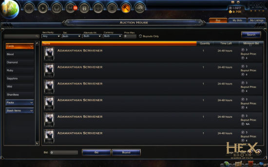 美服拍卖行展示有别于其他卡牌游戏,《HEX》拥有完善的物品流通体系。其主张玩家之间通过交换卡牌,感受集换式卡牌独有的乐趣。大家通过收集卡牌,构筑套牌,验证套牌,进行对战等一系列的行为获得一般卡牌游戏难以企及的高潮。动物园、无尽刷怪、抢BOSS统统没有,只有不许走,决战到天亮的快感。
