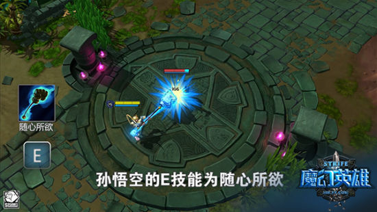 《魔幻英雄》孙悟空W技能随心所欲(E):孙悟空操控金箍棒,增加自身的物理伤害,同时提升攻击距离,持续一段时间。非常直接有效的能力提升,猴王也是有时也喜欢简单朴实的技能。