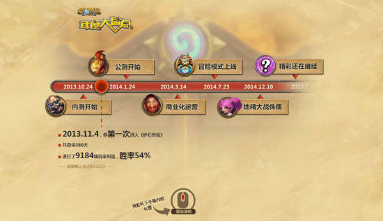我们永远记得2013年11月4日,《炉石传说》在国服开启内测,次年1月24日宣布公测,4月14日正式进入商业化运营,而7月23日推出首个冒险模式“纳克萨玛斯的诅咒”,12月10日更新地精大战侏儒,推出超过100张新卡,而精彩,还在继续……请乘坐时光机回到你第一次进入《炉石传说》的时间,然后让数据告诉你截止到2014年12月31日,你个人共登录游戏的天数,进行的与玩家对战场数,当然还有你的战绩胜率。然后继续从数据出发,深度解读你不为人知,甚至自己也没有统计过的精彩数据!