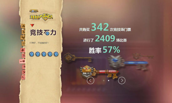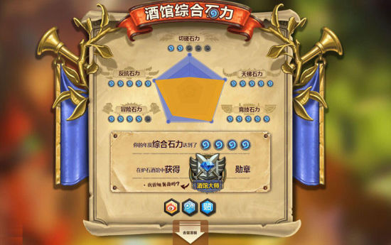 炉石“石”力看哪般——且看酒馆综合实力。四大组成力:竞技石力、天梯石力、冒险石力、竞技石力!竞技场你第一次初出的英雄和战绩,年度购买竞技场门票次数、比赛场数和胜率数据代表了你在竞技场中的成绩;天梯对战场数总计,胜利次数和最好成绩,让星星更多更璀璨;冒险模式闯入血拼次数,击败的首领总数是你刻在纳克萨玛斯的辉煌;反抗,绝地反击从一血到胜利的距离,你成功了多少次?全服平均又是多少?四大组成力综合评定,点亮你的炉石,颁发给你荣誉称号勋章。这是智慧的较量,谁主沉浮谁是王者,勋章是你的证明!