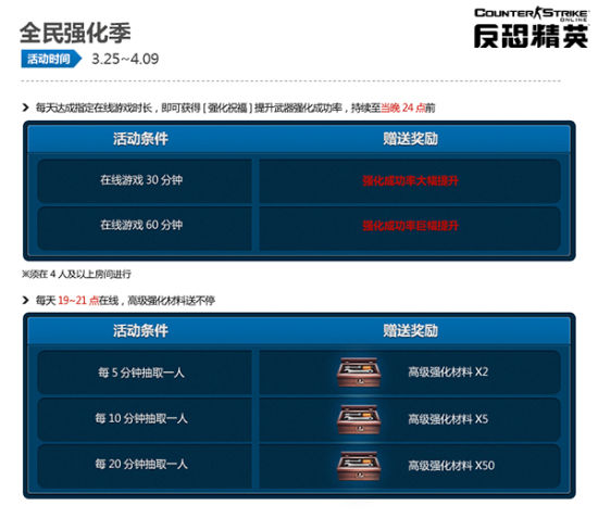 千万不要错过全民强化季疯狂开启!狂怒骑士WA2000强化升级得心应手!每天达成指定游戏时长,即可获得[强化祝福],提升武器强化成功率!每天19点至21点在线,每5分钟抽取1人送出高级强化材料(2个);每10分钟抽取1人送出高级强化材料(5个);每20分钟抽取1人送出高级强化材料(50个)