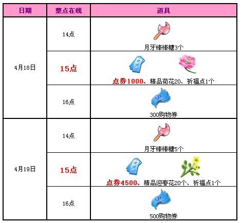 4月18日15点在线即可获得1000点券、祈福点1个。
