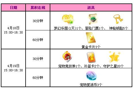 活动期间累计在线达到要求,即可获得黄金卡片、补签卡、 神秘钥匙、宠物用品等道具。