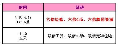 4.18-4.19每天14-16点将开启六倍经验、六倍G币、六倍舞团资源活动。4.19全天都将开启双倍工资、双倍心动、双倍宠物经验活动。
