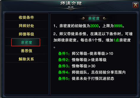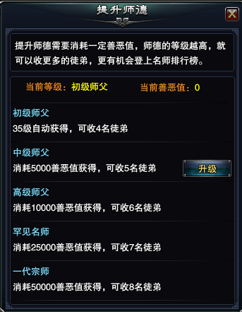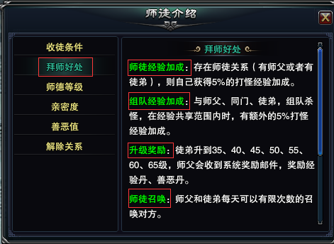 《大国》拜师好处当你的徒弟不尊师重道时,即每天不对师傅使用尊师重道功能,要及时督促他行使,或者解除师徒关系,注意解除师徒关系只能去NPC唐森(63,21)那里,点开对话框,点击“逐出徒弟”或“背叛师门”即可。行使师父的权利不仅使自己高高在上,而且还会获得经验值、善恶值的奖励,而善恶值可以在善恶值商店兑换道具,如金刚砂、星魂石以及各装备的打造图。其中获得的经验值有助于自己快速升级,何乐而不为呢。