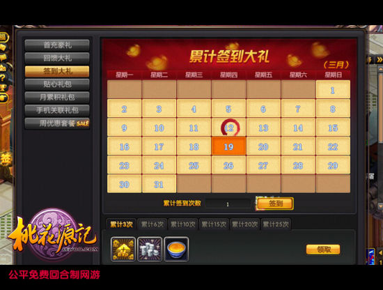 《桃花源记》所有服务器玩家,只需每月累计登录天满3天,即可领取签到大礼。连续签到次数越多,奖励也就丰富。每日登陆,轻松达成,礼包拿走!