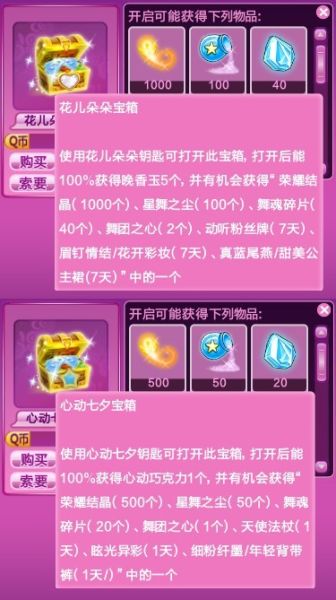 两种宝箱中,玩家们除了可以获得精美服饰外,更多玩家钟情于里面诱人的舞团资源,想瞬间获得大量舞团资源的玩家,就购买宝箱与钥匙吧。