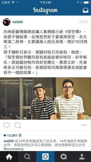 12日,余文乐在ins上发文称将与台湾型男彭于晏合作,出演由网络小说《悟空传》改编的大电影。据悉影片将由郭子健执导,彭于晏演饰演孙悟空,余文乐出演二郎神。影片将主要聚焦于主要讲两人的兄弟情,预计今年10月开工。这也是彭于晏余文乐二人自2002年在电视剧《爱情白皮书》里之后的首度合作。
