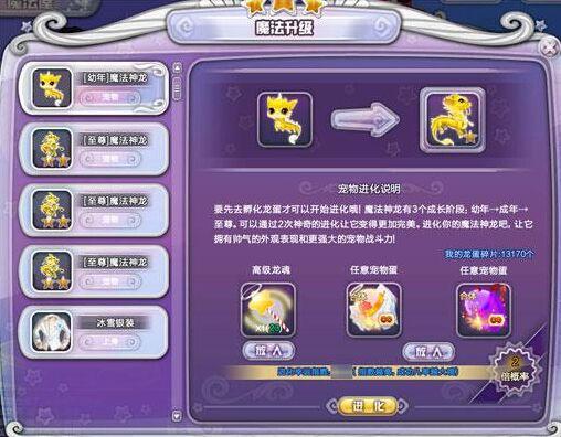 魔法神龙宠物蛋是神宠稀有度品级的极其珍贵的宠物蛋,该宠物蛋需要在魔法屋的“魔法神龙”合成入口进行合成。
