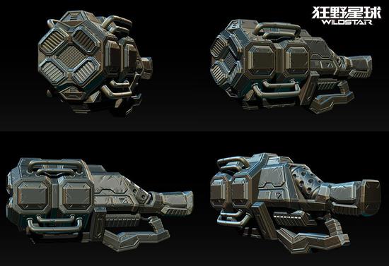 每个火炮的建模都是独一无二的,这是其中一把比较高级的火炮的建模,你可以看到上面又不少地方有折损的痕迹,这种由金属折旧产生出来的真实感是美式科幻中的精髓。