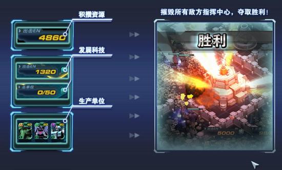 初始能量400,每1秒增加10点能量,1000点能量可以升级到15秒能量/秒,而后是1200,1600以此类推,初始人口为60,一次升级固定1200点能量,增加20人口,以此类推。双方小兵会在周围没有两方建筑的情况下对A,若进攻方攻击一片建筑,在赶往下一片建筑的同时遭受到守方攻击则会反击(建筑要离的很远),所有兵种在击杀目标之后因为AI的问题,硬直很长。ACE机体大招各有千秋,几别几个ACE具有3000AOE伤害的技能,虽然蓄能时间很长,但有绝对的逆转可能,极其IMBA。