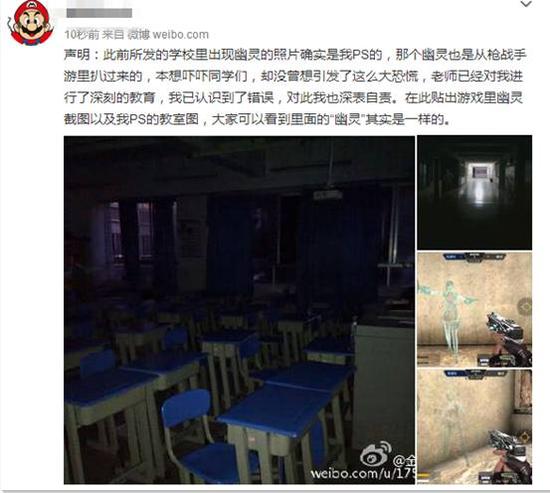 原来,这一切都是他自己自导自演的,该学生在班里属于“活跃”分子,他本想PS几张教室的幽灵图来吓唬一下班上同学,事情却越闹越大。而图片上的所谓幽灵,则是他从平时玩的手机游戏《全民枪战》里面截取而来,竟也达到了以假乱真的地步。学校领导了解到事实真相之后,对其进行了批评教育并记了一次大过,让其删除了相关贴吧和微博的图片。