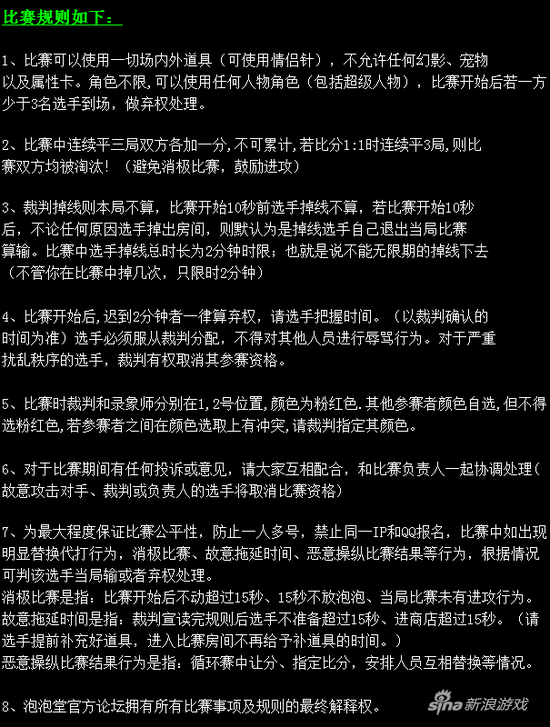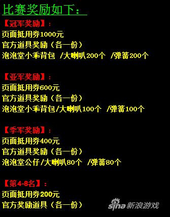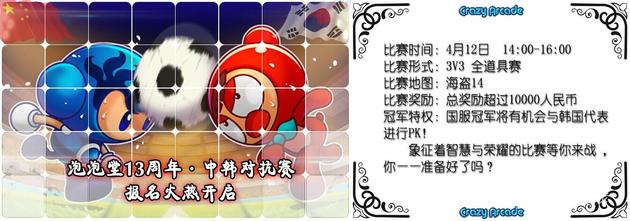 为了庆祝游戏十三周年,官方将举办“泡泡堂13周年庆典活动---中韩海盗14对抗赛”。比赛为全道具赛,将采取3V3,3局2胜制,冠军有机会与韩国代表队展开PK。