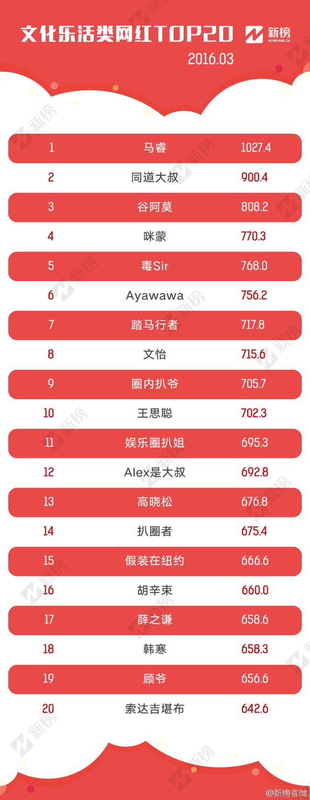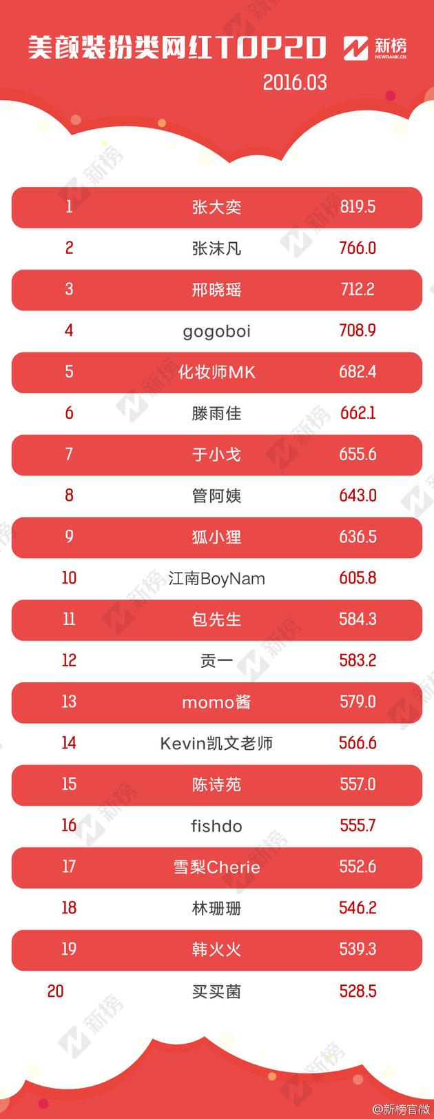 基于以上筛选标准,新榜对分散在微博、微信公众号、优酷、腾讯视频、爱奇艺、搜狐视频、美拍、秒拍、YY、斗鱼、虎牙等各个网络平台的网红进行汇总,形成近2000个网红样本,并针对这些网红的自身传播能力和声量,进行数据采集和分析,最终生成2016年3月“网红排行榜”100强榜单,以及“美颜装扮”、“才艺搞笑”、“游戏电竞”、“文化乐活”四大分类榜单,具体算法附于文末。