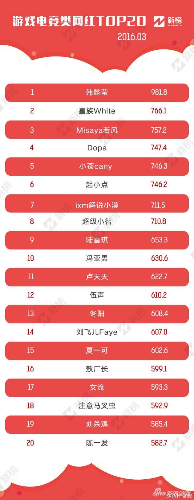 新浪游戏讯 4月14日消息,@新榜官微 日前发布了新鲜出炉的全平台网红排行榜TOP100,包括Miss、皇族White、若风、小苍等知名游戏解说都入榜,Miss更是高居榜单第四的位置,力压同道大叔、艾克里里等人气网红,成为电竞解说中的翘楚。