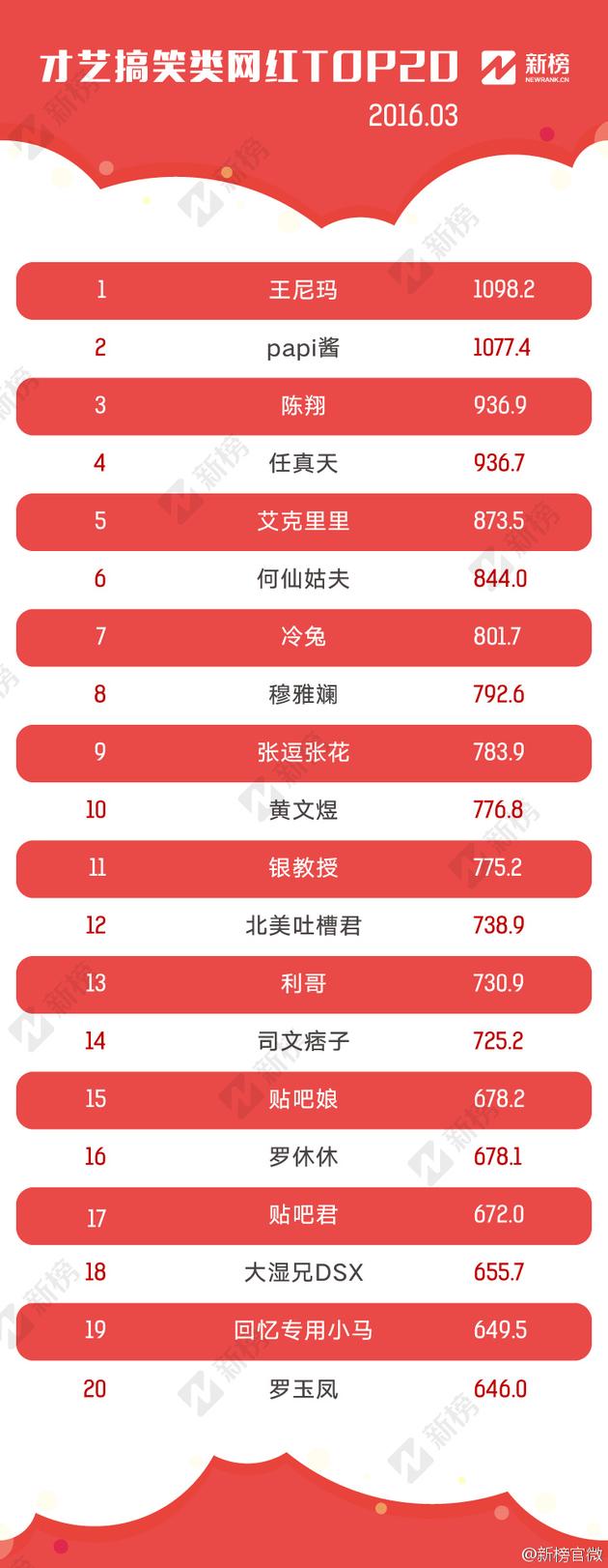 2016年3月全平台网红TOP100排名