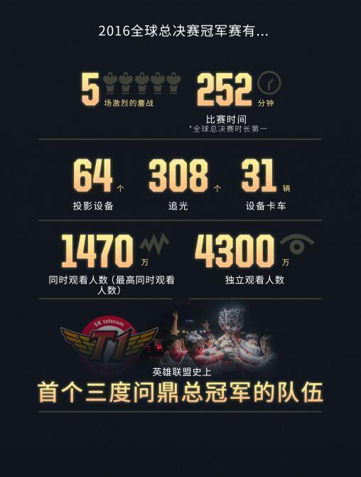 此外,SKT与SSG的这场终极对决,最高同时在线收看人数超过1470万,相比2015年全球总决赛高出70万人次。而冠军战超过4300万人的独立观看人数,更是大幅度超越2015年的3600万,成为了历届冠军战观看人数最多的比赛。最终,2016全球总决赛以SKT的夺冠而画上句号,SKT就此成为了《英雄联盟》赛事史上首支三度问鼎全球总决赛冠军的战队。