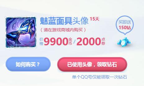 1 在活动页面上使用Q币充值钻石,5Q币充值50钻石。在游戏客户端购买并使用魅蓝面具头像,赠送150钻石,单个大区头像只限购买一次。充值的钻石会在页面上显示。