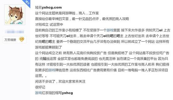 2015年的时候,B导创建了了一个网游商人主题的网站,名为游戏红茶馆(yxhcg.com)。随后在他经常混迹的“剑灵商人吧”里发了一帖宣传: