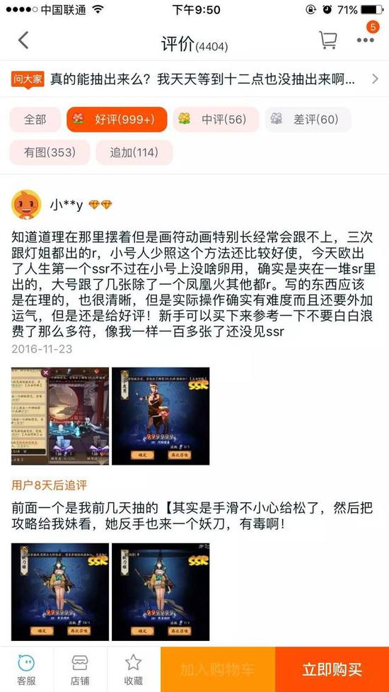 淘宝上有20块一套的“阴阳师画符/抽卡”攻略,并且销量已经过万。我被一万多的销量惊呆了,开始还以为是刷的,但翻了半天评论怎么看都不像。《阴阳师》非玄学SSR抽奖秘籍商品页面下,足足有四千多条情真意切的评论,甚至还有不少很戏剧性的追评。
