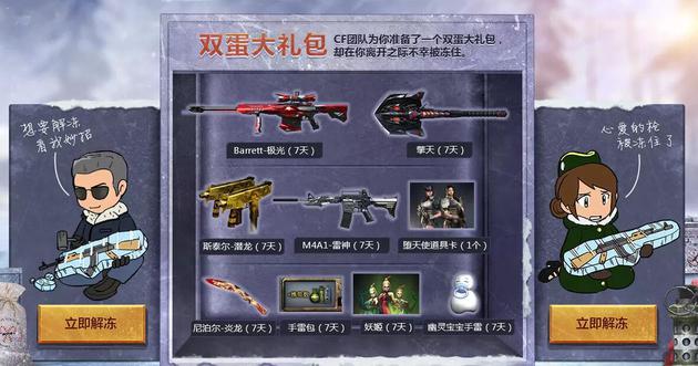 随着圣诞节和元旦的到来,CF也开启了双蛋狂欢送英雄枪活动,此次活动为所有玩家送上了一次解冻武器的机会,下面一起来看看活动详情。