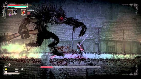 从视觉上来说,这款游戏非常容易让你联想到《黑暗之魂》——尤其是它的UI,这个游戏的诞生受到了两个游戏的影响,还有一款是《恶魔城:夜之交响曲》。