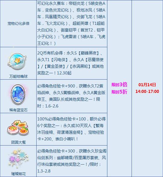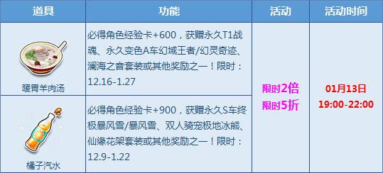 1月13日19:00-22:00、1月14日-15日14:00-17:00期间,宝箱折扣+多倍活动惊喜来袭,【暖胃羊肉汤】等多款宝箱倾情奉献,宝箱最高3倍+5折陪你嗨,赢永久T2【紫焰战神】等多款极品道具,还有新年幻化特别活动5折开启,月中狂欢,不容错过!