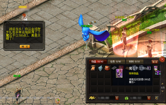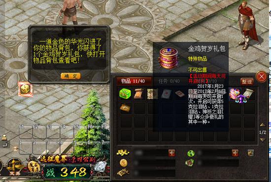 新春之际,福利多多,2017年1月23日至2017年2月6日期间,90级以上的勇士登录游戏即可获得1个金鸡贺岁礼包。