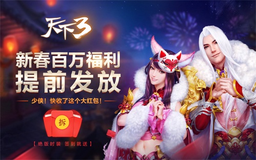 《天下3》恭祝各位玩家2017新春快乐!在活动期间每天登陆将自动点亮一盏灯笼并可领取一枚新春红包,当点亮10盏和20盏灯笼后,还可以领取更多新春大奖!初一到初十每日还可以解锁一段开发组成员拜年语音哦,快来调戏他们吧!