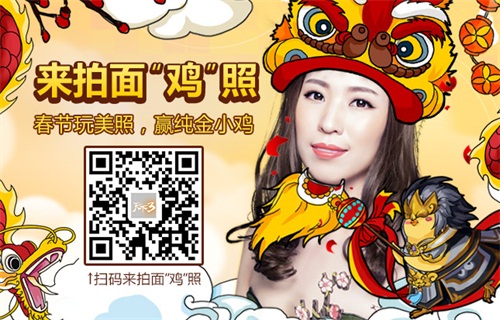 新年到,金鸡送福欢乐晓!《天下3》新春H5《来拍面“鸡”照》首发上线!代表神州大地东南西北的多款精美贴图随心选,陪你show出鸡年新风采!拍照即有机会赢定制纯金好礼,更有小鸡幻化丹,全新特效烟花等你来拿!新年心意暖,大荒情更浓,扫一扫上图中的二维码即可参与H5赢取元夕大礼包!同时,该二维码于游戏内、《天下3》公众号内也可每日获取!2017,晒出你的面“鸡”照,大荒陪你一起迎新春闹元夕啦!