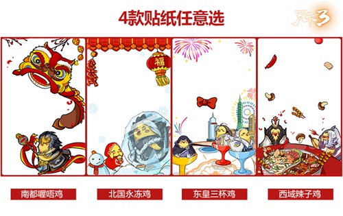 多款精美贴纸随心选,四方鸡萌同贺天下新春!无论你是想扮靓,还是耍帅,《天下3》众男神“鸡”都会在一旁为你们喝彩!