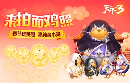 鸡年面“鸡”好,自拍不可少!《天下3》新春H5《来拍面“鸡”照》首发上线,春节秀自拍,百分百元夕奖励等你来;还有机会赢六福纯金小鸡,还不快来一起美拍一起嗨!金鸡报晓响彻天下迎春早,鲲鹏展翅遨游大荒福利到!《天下3》上线即领奖,福利不迟到,上线领绝版时装“海棠未雨”喜迎新春福利驾到!这个天下让我们一起玩转新春,这个新春让我们一起玩转天下。