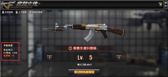 武器升级所需消耗的“升级材料包”可通过火线币在商城进行购买,且“武器升级系统”中升级的武器可永久使用。目前已知的武器属性升级效果包括:装备刺刀,EP加成、装弹数提升等等。