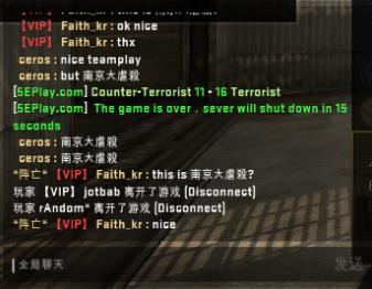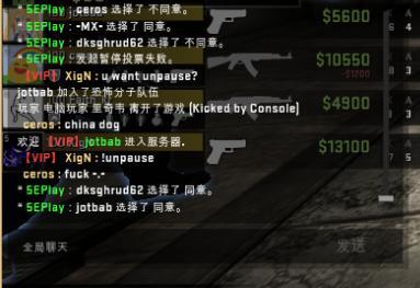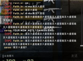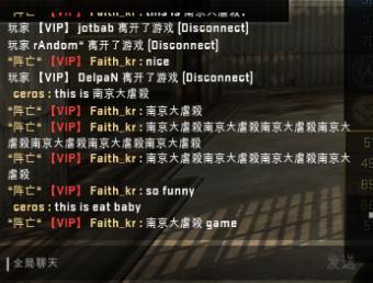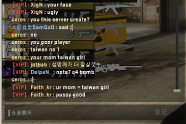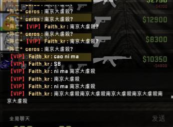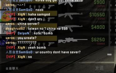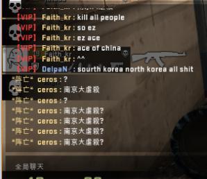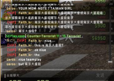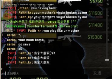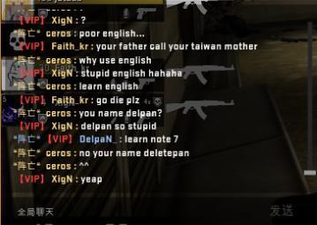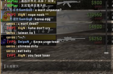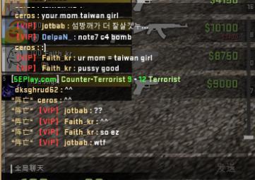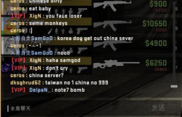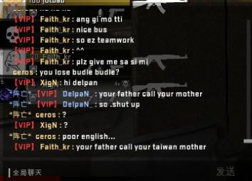 之后,依旧是在暂停时间,但是双方玩家开始了不理智的互相对骂。CT方的中国玩家甚至以为对手并不是韩国的职业战队MVP的选手,认为MVP选手的素质很高,当然他们错了。但是XigN,ceros以及Fatih_kr的嘲讽一波接着一波(甚至包含了淫秽词语),具体看图。我承认中国玩家在这上面输了,输出完全不足。