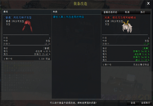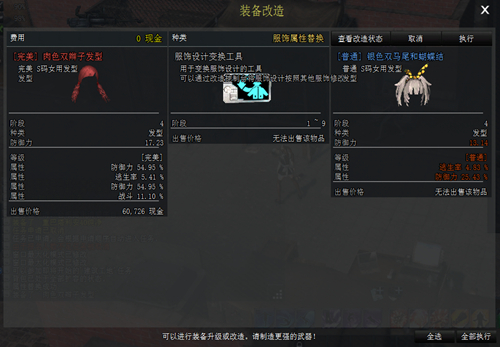点击右上角执行,我们可以看到,肉色双辫子发型的所有战斗属性全部转移到了银色马尾和蝴蝶结上。样式属性一气呵成。相同的,上衣下衣也是这样去操作。大批量进行转化时,可按右下角全部执行。