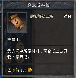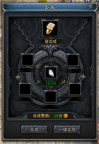 集齐10个原石精华后,右键点击穿云戒卷轴,打开合成界面,即可合成道具“穿云戒”!