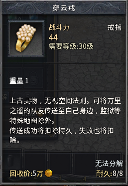 1。玩家佩戴了“穿云戒”后,必须满足以下所有条件才能将其他玩家传送至自己身边: