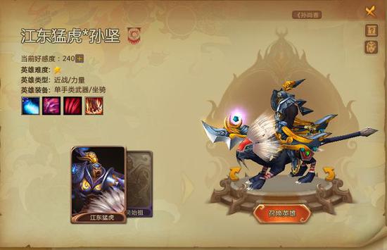 孙坚,神皇孙权之父,岘山之战中被刺杀身亡,此后化作猛虎之魂继续为守护神族而浴血奋战。孙坚手持一把古锭铸魂刀,挥舞间,划破万千敌军之喉;他体内蕴藏无限能量,若在顷刻间爆发犹如猛虎怒吼,震波所过之处死伤无数;他一身白虎圣甲,更是坚如磐石,刀枪不入,更能抵抗高强法术,令敌军无可奈何。