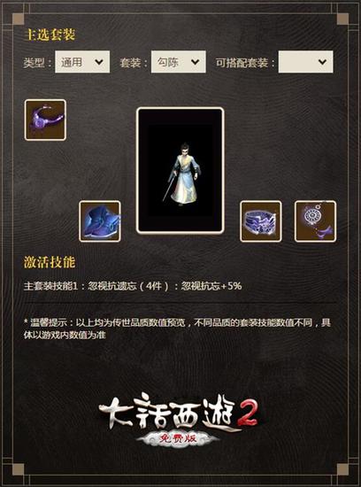 “勾陈”套装由项链、鞋、挂件、腰带组成,拥有套装技能忽视抗遗忘,效果为忽视抗忘+5%。