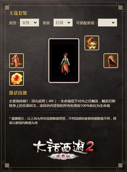 “红泪”套装由衣、面具、武器、披风组成,技能为回光返照(4件):生命值低于45%之后触发,触发后移除身上的负面状态,该回合内受到的所有伤害按100%转化为生命值。