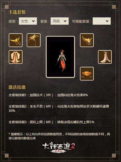 “凤鸣”套装由帽、衣、项链、面具、披风、腰带组成,技能1为加强法术(3件):加强仙法鬼火伤害8%;技能2为生生不息(6件):仙法鬼火伤害按照出手次数循环递增30%;技能3为提抗上限(6件):换取冰混忘睡抗性上限5%。