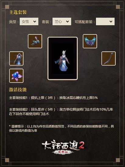 “兰心”套装由帽、衣、面具、武器、披风组成,技能为提抗上限(3件):换取冰混忘睡抗性上限5%;技能2为回头是岸(5件):敌方单位释放师门法术后有10%几率在下回合不能使用师门法术。